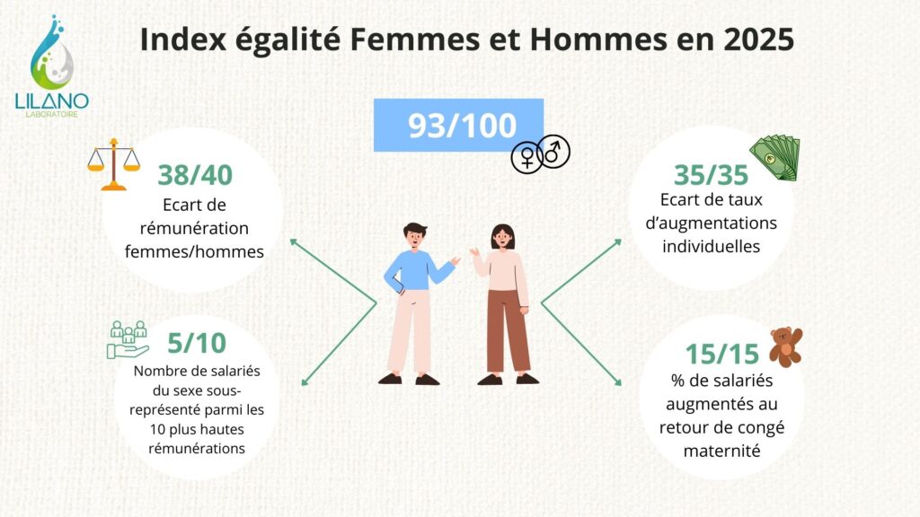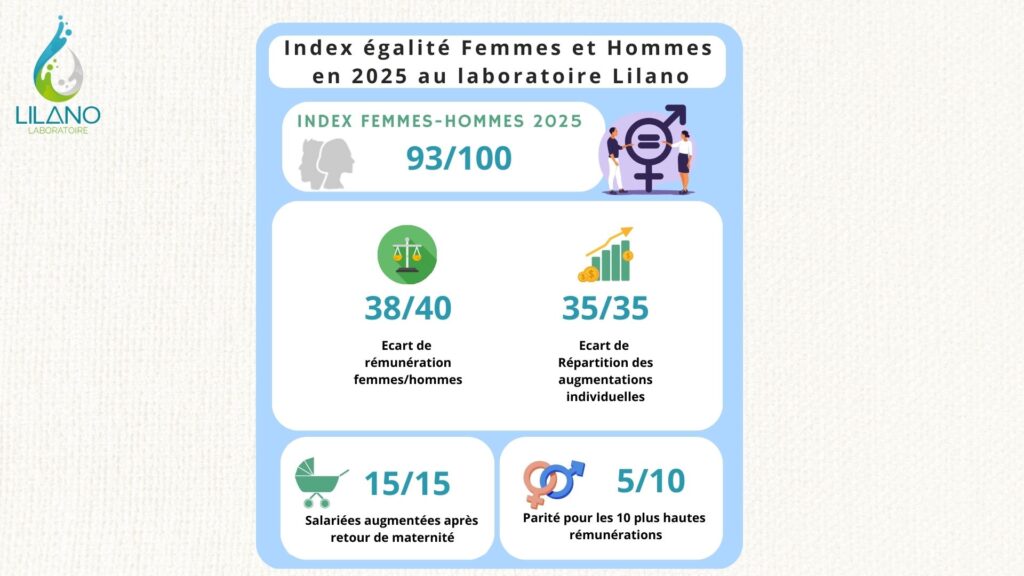 Au Laboratoire Lilano, l’égalité professionnelle entre les femmes et les hommes constitue une priorité majeure. Chaque année, nous évaluons notre situation à travers l’Index égalité Femmes-Hommes, un indicateur national qui mesure objectivement nos actions en matière d’équité.